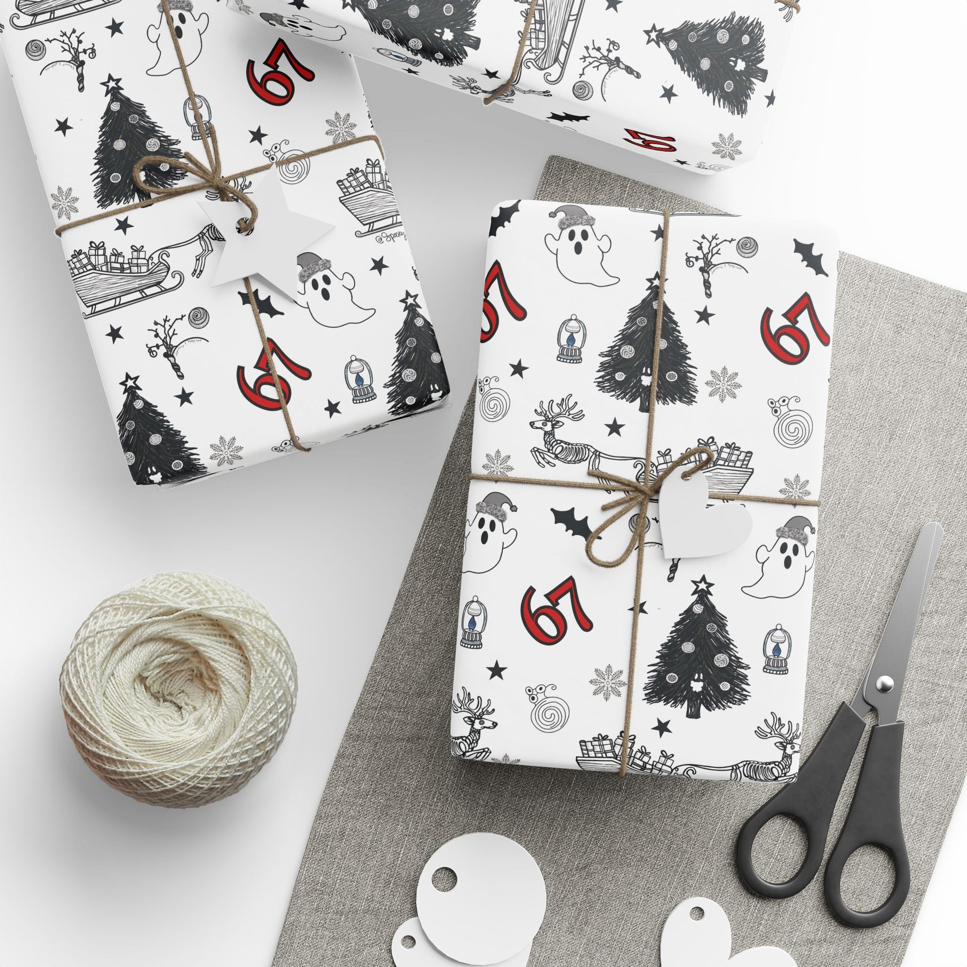This Monochrome Holiday Fusion wrapping paper is the perfect festive addition for those who love both the spooky fun of fall and the joy of the winter season.