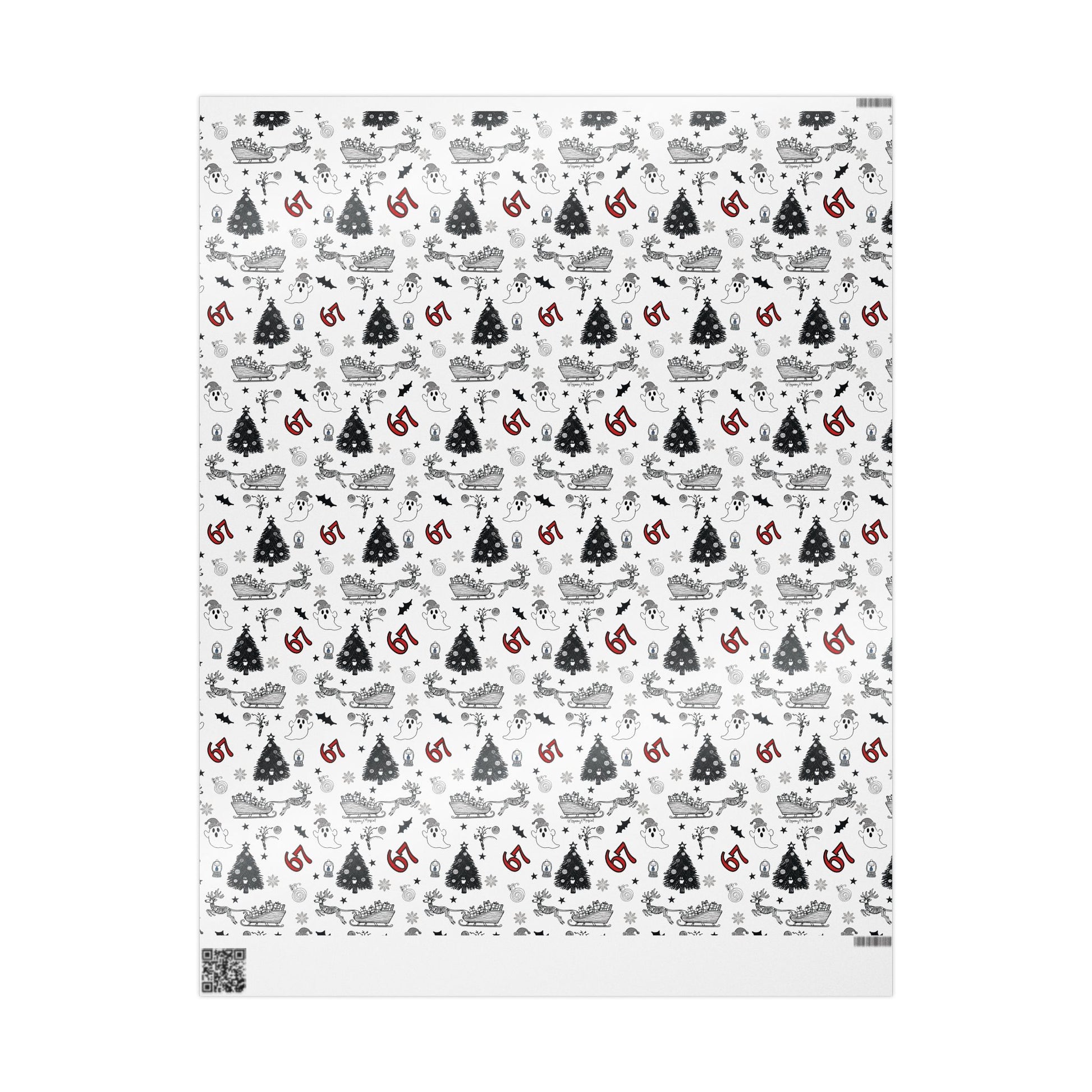 Unique Pattern Blend: Features an all-over, repeating black and white pattern that stylishly combines Halloween and Christmas motifs, including the famous number 67, spooky ghosts, Christmas trees, and reindeer pulling Santa's sleighs.