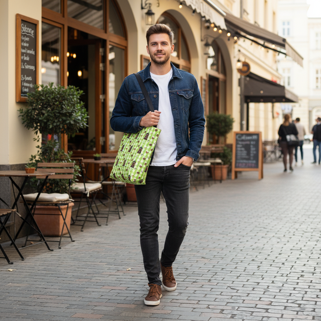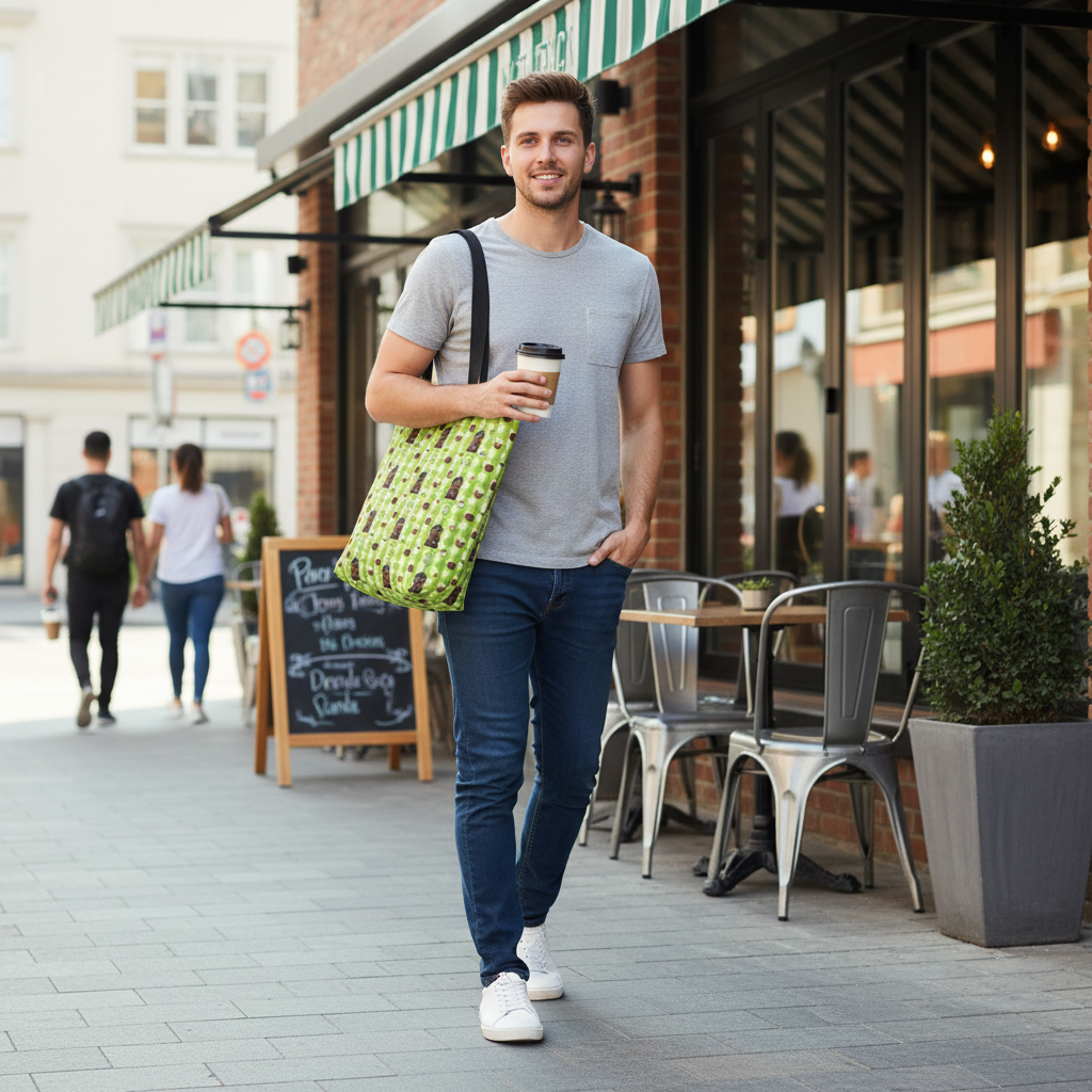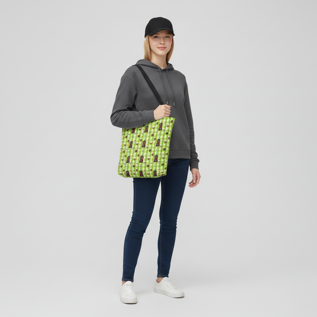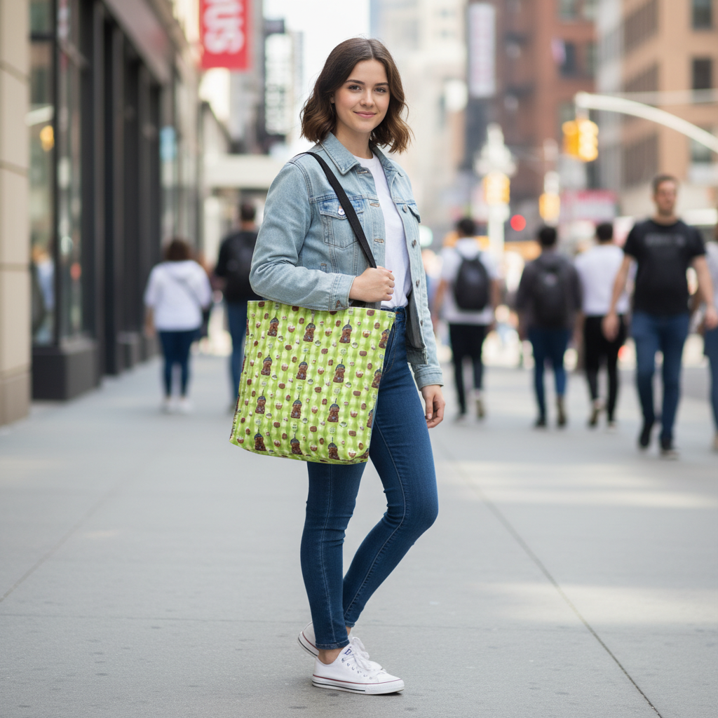 This vibrant tote bag features an all-over print of our fan-favorite Bearista and a delicious assortment of kawaii sweets, all set against a classic green gingham background. Whether you're headed to the farmer's market, the library, or your local coffee shop, this bag is designed to hold all your essentials while keeping your aesthetic on point. Made from durable 100% polyester, it’s built to withstand daily use while retaining its vibrant colors. With its spacious interior and boxed corners, you can effortlessly fit all your essentials and more, making it a versatile companion for anyone on the go. This tote bag is an ideal gift for anyone who appreciates unique and fun accessories. Perfect for holidays, birthdays, or just to brighten someone's day! Product features - 100% polyester body for durability and quick-drying - Reinforced stitching on handles for extra strength - Boxed corners for added storage space - Available in five handle color options - Comes in three convenient sizes to suit your needs. 13x13", 16x16" Care instructions - Remove all items from the bag before cleaning. Suggested to pretreat visible stains with stain remover. Mix warm water with laundry detergent and clean the bag with terry washcloth or a soft bristle brush. Let the bag air dry. Note on Color: Please be aware that actual colors may vary slightly from what you see on your screen. Every monitor or mobile display has a different capability to display colors, and every individual may see these colors differently. We strive to present our products as accurately as possible, but the physical print may have a slight difference in saturation or hue.
