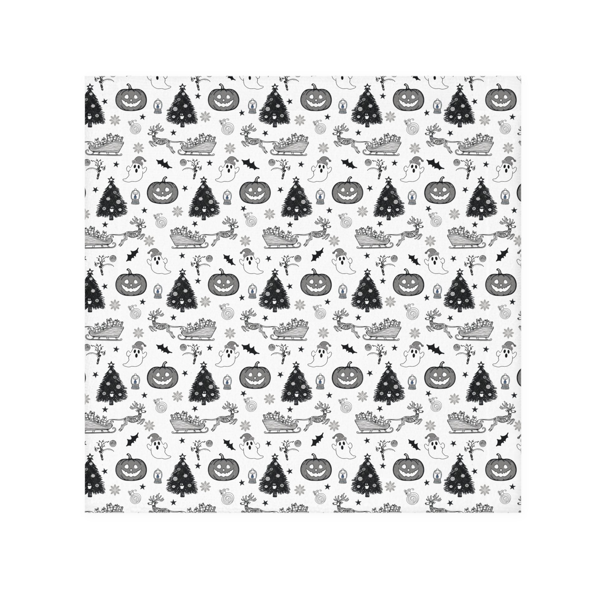 Unique Pattern Blend: Features an all-over, repeating black and white pattern that stylishly combines Halloween and Christmas motifs, including smiling jack-o'-lanterns, spooky ghosts, Christmas trees, and reindeer pulling Santa's sleighs.