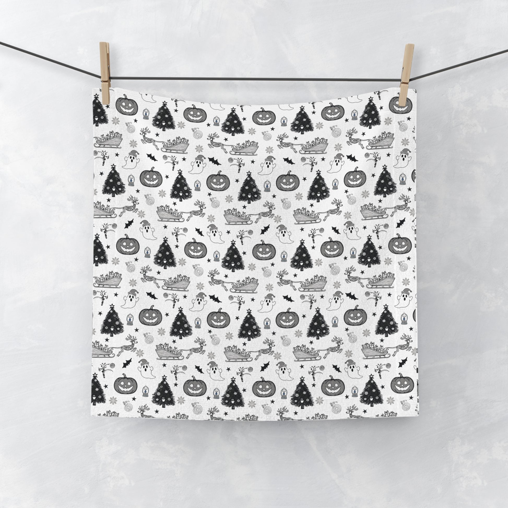 This Monochrome Holiday Fusion Hand Towel is the perfect festive addition for those who love both the spooky fun of fall and the joy of the winter season.