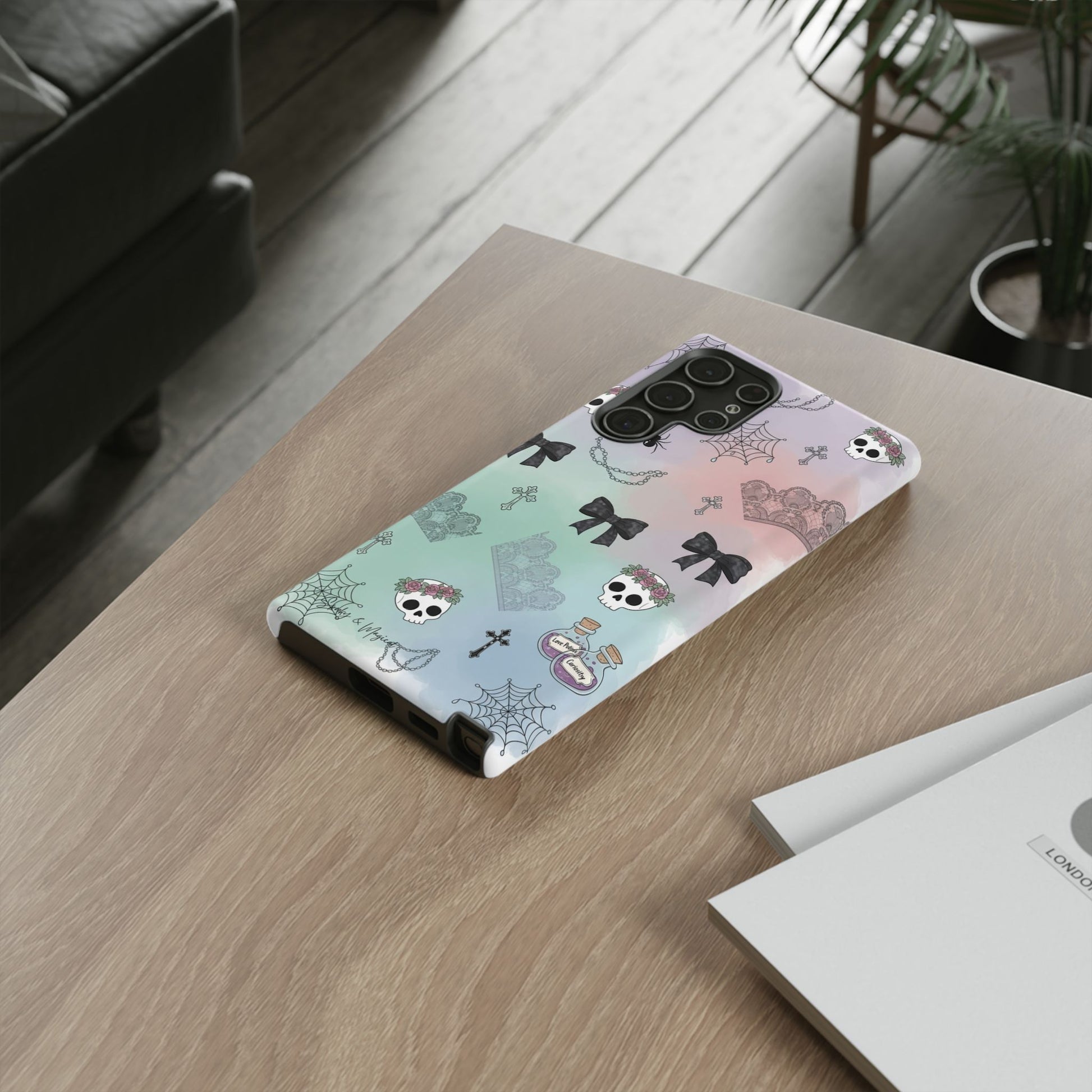 A dual-layer protective phone case that mixes playful goth charm with everyday utility. Soft pastel gradients meet hand-drawn skulls, lace crowns, bows, and tiny potion bottles for a look that’s both delicate and delightfully dark. This case wears like an accessory—adding personality to daily routines and grounding whimsical style in real protection.