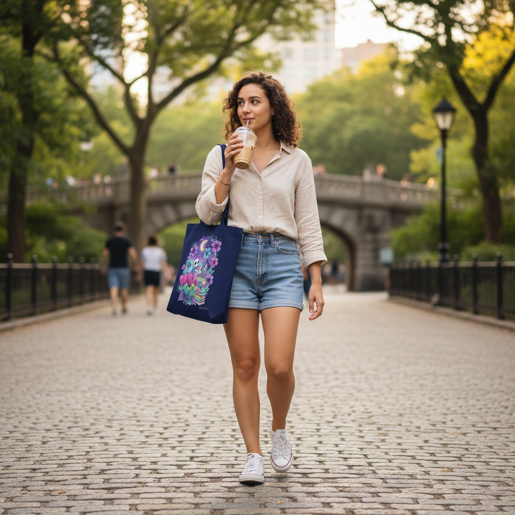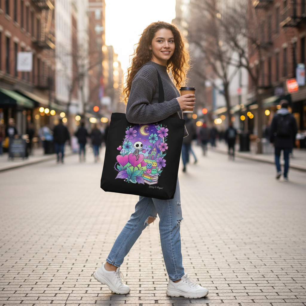 Soft, sturdy canvas that carries more than groceries — it brings a little night-sky whimsy to errands and everyday adventures. A crescent moon glows above a tiny skeleton reading among oversized blossoms, stacked books, and friendly mushroom neighbors. The illustration’s bright purples, blues, and pinks pop against light or black canvas, turning this tote into a wearable story: coffee runs, library hauls, market days, and slow evening walks all get a playful, cozy edge. Lightweight yet rugged, it folds into a bag for quick market runs and opens wide for larger finds.